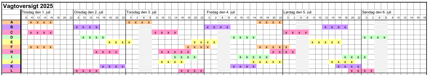 Som medarbejder i boden følger du en bestemt vagtplan. Ovenstående er et eksempel på, hvordan vagtplanen kan se ud. Vi kan endnu ikke udarbejde et udkast til vagtplan for 2026. Det kommer senere på foråret, hvor vi kontakter de frivillige som er tilmeldt for at indhente ønsker til vagter. Den endelige vagtplan udsendes senest d. 1. juni 2026.